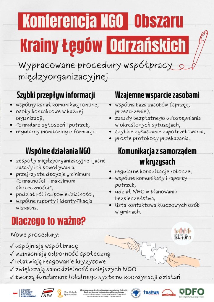 Konferencja dla organizacji pozarządowych z Obszaru Krainy Łęgów Odrzańskich odbyła się w ramach działań na rzecz wzmocnienia współpracy między NGO, grupami nieformalnymi oraz jednostkami samorządu terytorialnego. W wydarzeniu uczestniczyło 41 osób, reprezentujących lokalne organizacje społeczne, samorząd oraz inicjatywy obywatelskie. Celem spotkania było wypracowanie praktycznych narzędzi i zasad usprawniających wzajemną współpracę, szczególnie w kontekście reagowania na […]